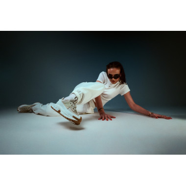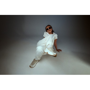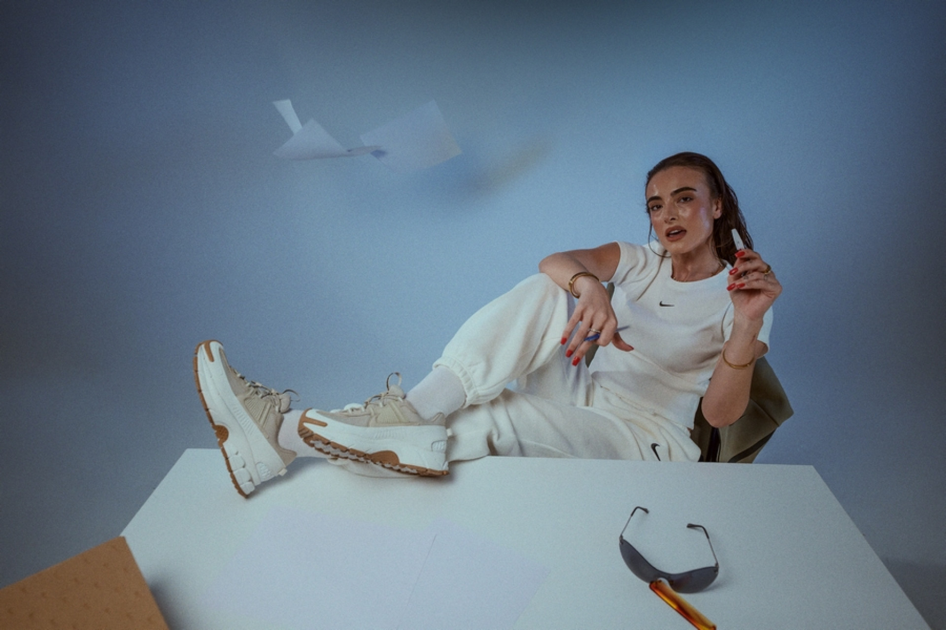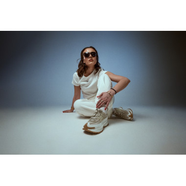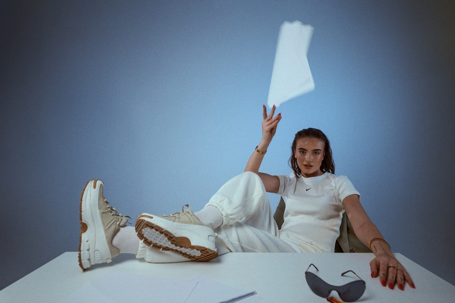 A stúdió teljes szabadságot adott a játékra a pózokkal, a fénnyel és a mozgással. A kis asztal nem csupán kellék volt, hanem kontraszt — egy munkahelyi pillanat, amely divatos energiával olvad össze. Pontosan itt mutatkozik meg, mennyire könnyedén alkalmazkodik a NIKE ZOOM VOMERO ROAM: egy aktív napból egy tudatosan megkomponált szettbe, anélkül hogy elveszítené a karakterét.